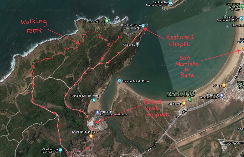 We set off fairly early though, and on the way there had an idea to go round the bay to Salir do Porto. We had been there before for a nice lunch, but I had recently read about the ruin of the chapel (capela de Santa Ana), which overlooks the entrance to the sheltered bay of São Martinho do Porto. It had recently been renovated and restored using traditional materials and techniques thanks to EU funding. So one of the goals was going to be to check that out.