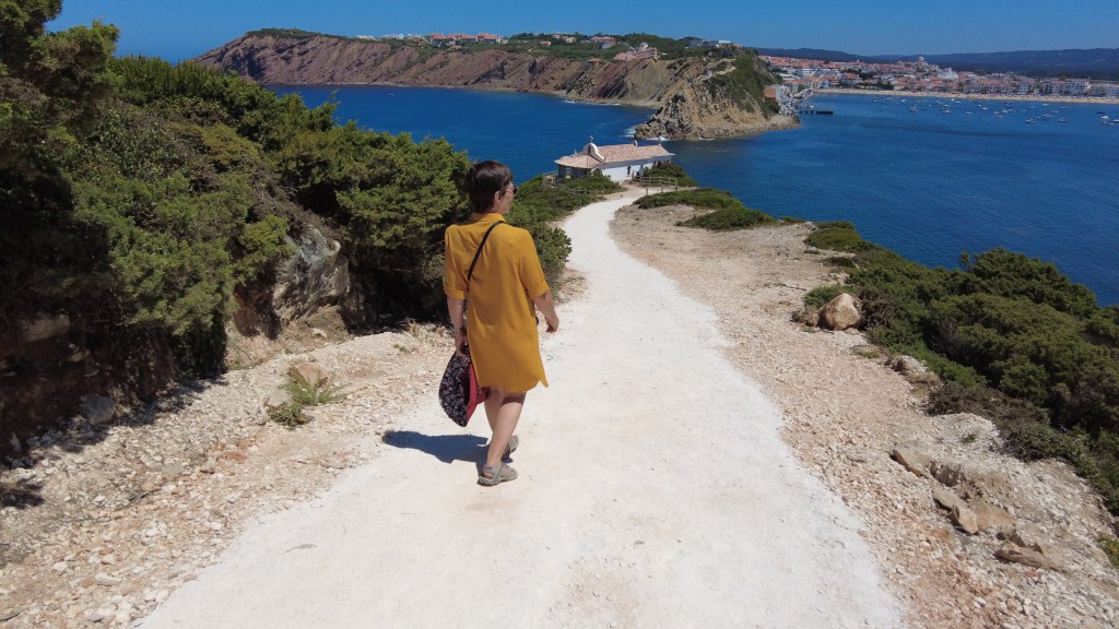 We set off and took the turning in Salir do Porto signposted to the miradouro (viewpoint). At the top of the road we took the track headed for the chapel instead of the steep path to the viewpoint. That was way too much “Up” for that time of the day! We also veered off the track to the chapel to walk along the coast path for the amazing views of the deep blue Atlantic Ocean. They seemed to be trails for mountain bikers more than walkers, but pretty easy going until we got to the headland parallel to the chapel which was a steep climb up sand dunes, a real lung buster!
