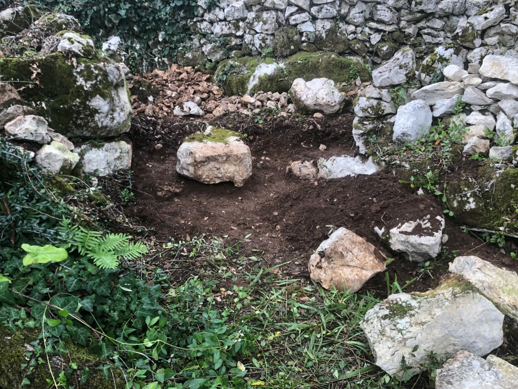 Wayne has also been busy clearing out the colapsed wall section in preparation of rebuilding a small gap and practising with the limestone rocks to see what works.