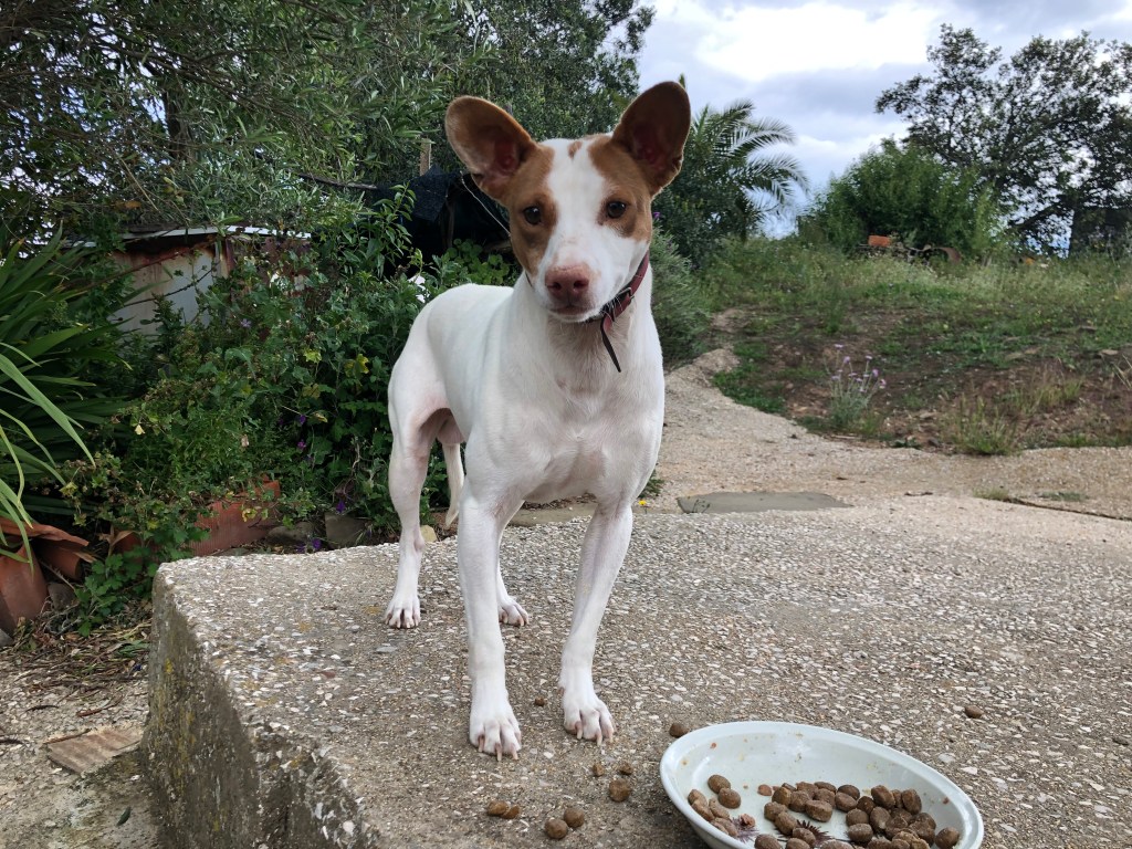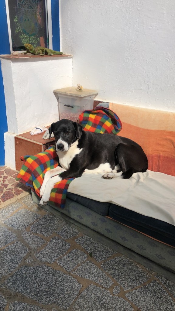The two dogs were Davy and Lady. Both rescue dogs. Davy was an old boy around thirteen years old and has the most gentle temperament imaginable. He really craved human contact and was even known to get excited when a walk down the lane was on the cards. Lady on the other hand was much younger and although quiet and subdued during the day, which were all very hot during our stay, she came to life as the evenings drew in and became cooler. She had a traumatic early life and was slowly becoming much better, but was still very wary of anything that moved and seemed to bark at the slightest noises or movement until a quick ˋquiet Lady´. She has the most charming character and loved being brushed in the mornings and she was molting too! They were very easy going and no problem at all to look after. There was also a small dog who lived in the village who we fed each night. He didnt belong to our house owners, but they took on the responsibility to feed him when his owner died and he was left alone. The relatives did try to catch him, but he wont let you touch him, so he continues to live in the abandoned house but is never short of food or water, and has a bed and seems happy enough.