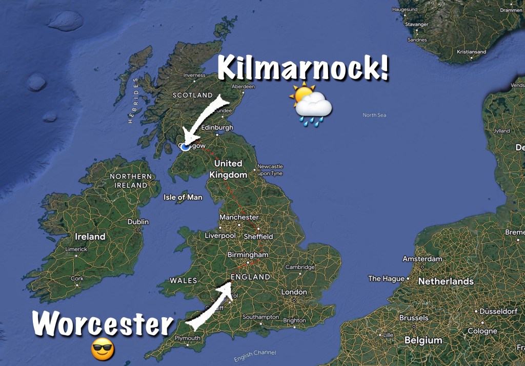 The weather hadn’t been too bad as the UK was still in the grip of a heatwave etc, but it is Kilmarnock in Scotland we are talking about! We had to both get our raincoats on during the stay, so at least it justified packing them. It was the first time we have had to wear them… well, since the last time we were there! 😂😂😂.