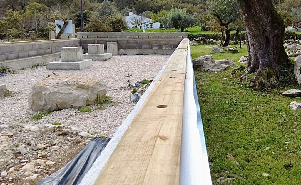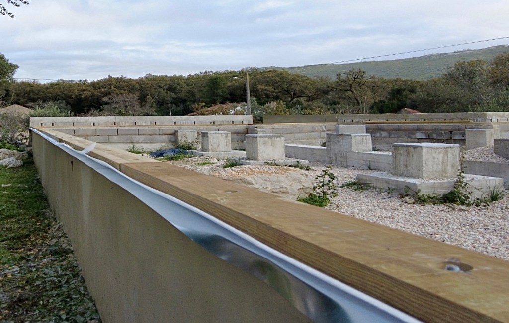 So, the following day, we were intrigued to see what the builders were doing. We jumped in the car and went back to check. It seems like they are preparing for the wood frame and it needs to be insulated from the block foundations and it was good to see this had been started. It was super important for us to have a warm comfortable home in the colder months here in Portugal. The wood frame construction is enabling the main structure to be isolated from the block foundation which does get damp in the rain and will therefore add to the thermal insulation properties that we are aiming to achieve.