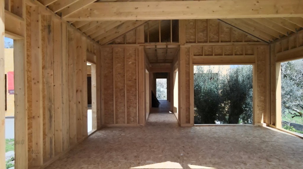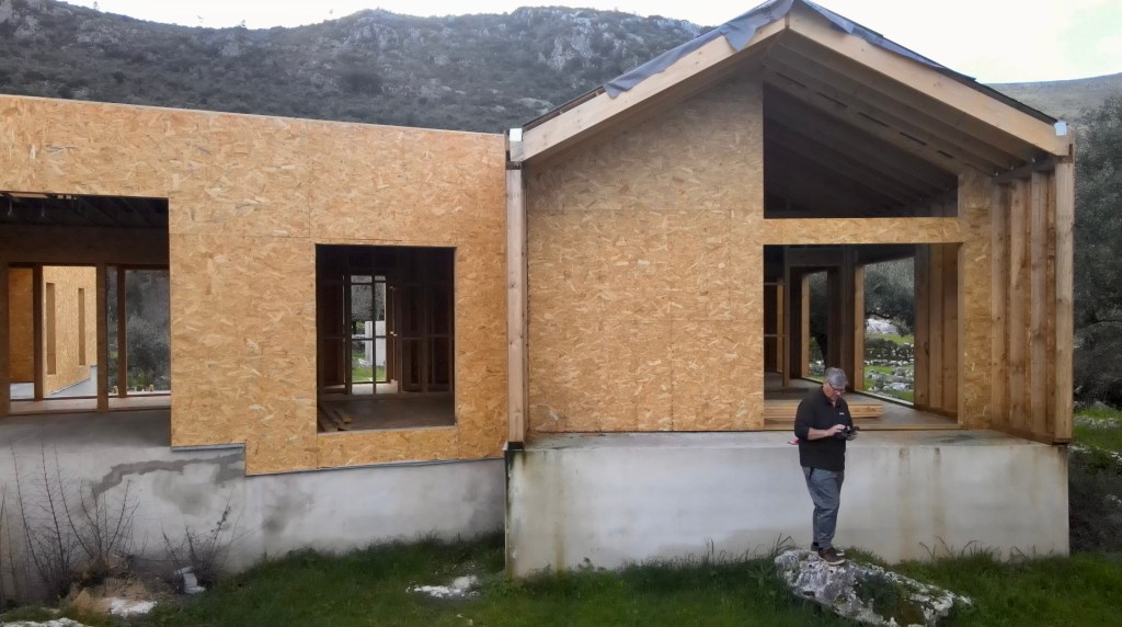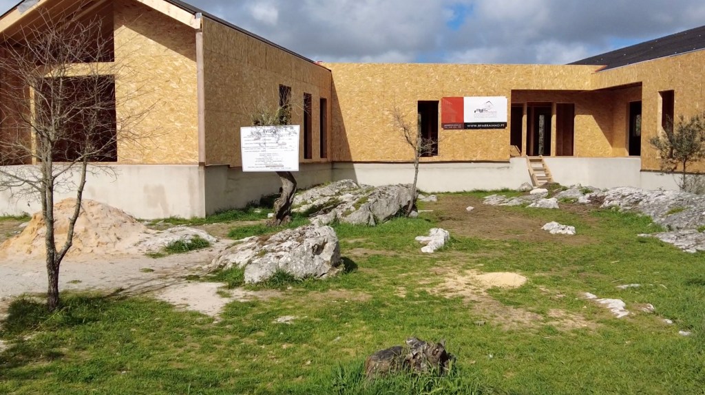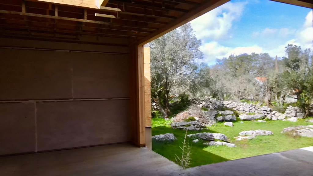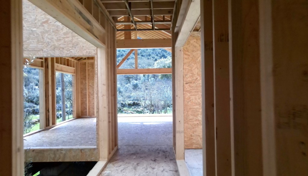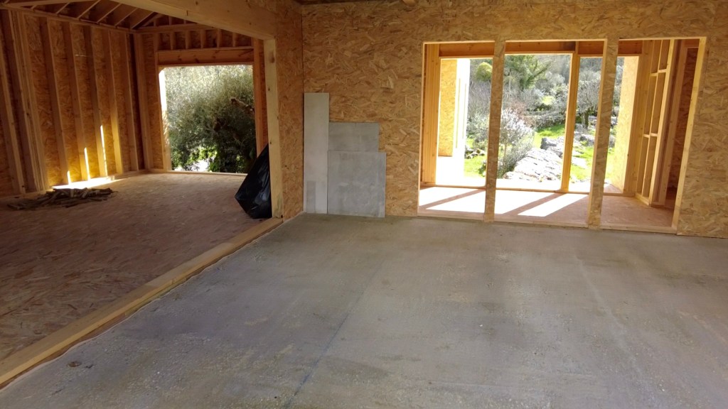 What a surprise. There has been significant progress since we left for the Algarve. The private part of the house (bedrooms and bathrooms), now has a waterproof membrane, as does the living part (Kitchen, pantries and living-room). The central joining part (Office, mechanical room, WC and closet) has a roof but still needs waterproofing. [note: this has been completed before uploading this post] All the internal framing seems to be just about complete and the ceilings were being prepared for drywall (plasterboard). There is some conduit fitted too. The doors and windows are still to go in, but we are assured it’s not far off, with stone sills going in shortly.
