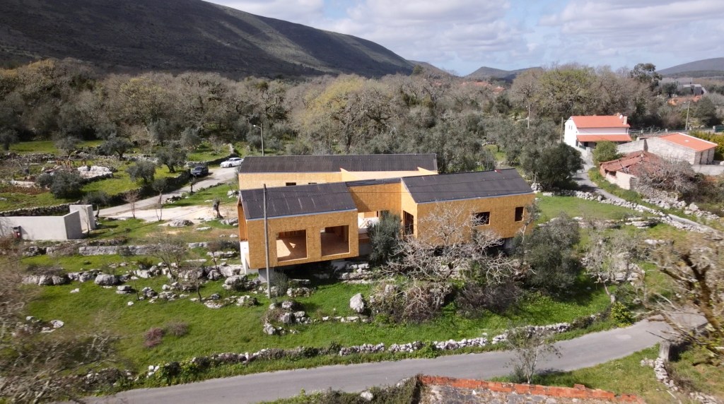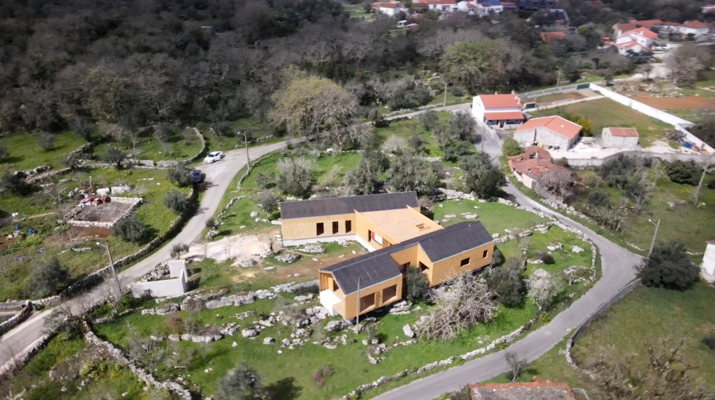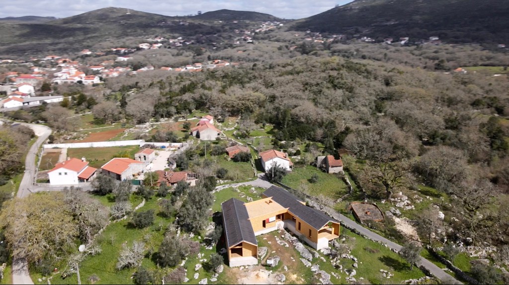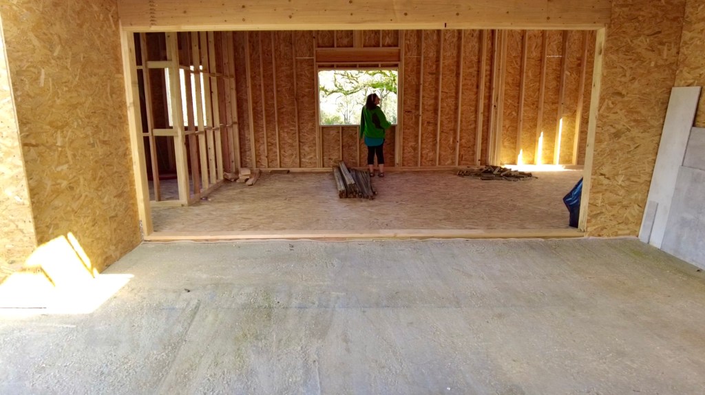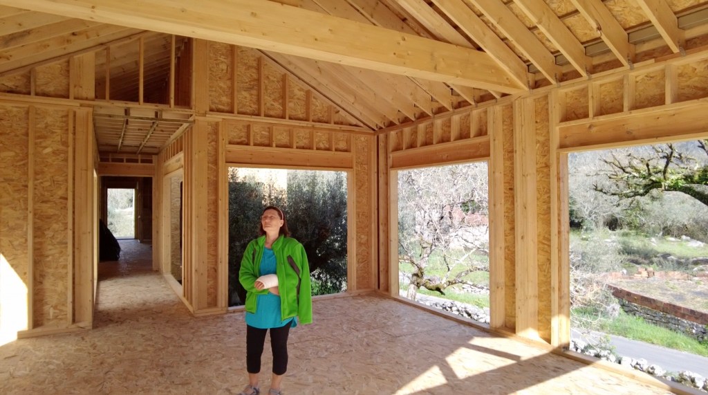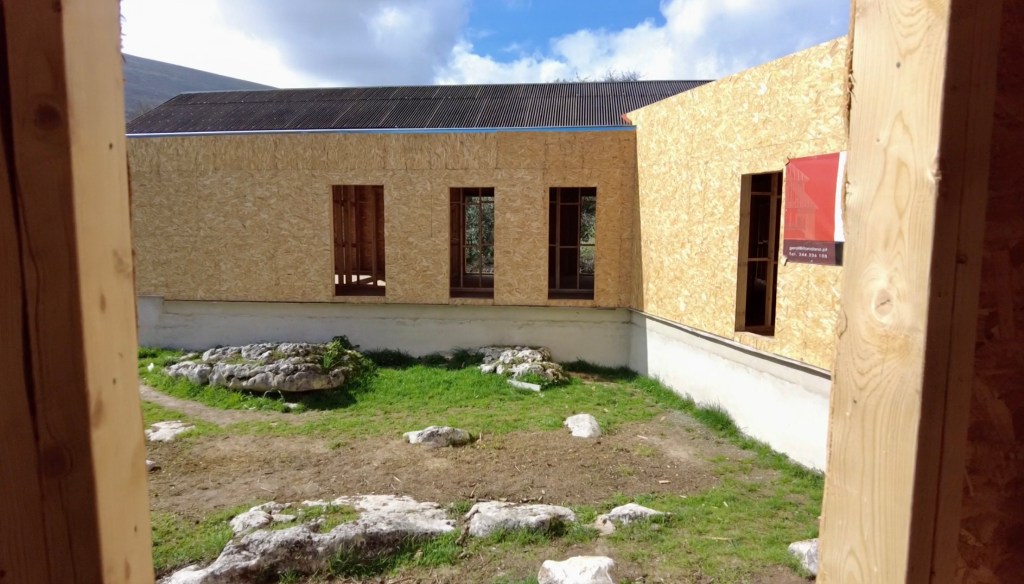 What a surprise. There has been significant progress since we left for the Algarve. The private part of the house (bedrooms and bathrooms), now has a waterproof membrane, as does the living part (Kitchen, pantries and living-room). The central joining part (Office, mechanical room, WC and closet) has a roof but still needs waterproofing. [note: this has been completed before uploading this post] All the internal framing seems to be just about complete and the ceilings were being prepared for drywall (plasterboard). There is some conduit fitted too. The doors and windows are still to go in, but we are assured it’s not far off, with stone sills going in shortly.