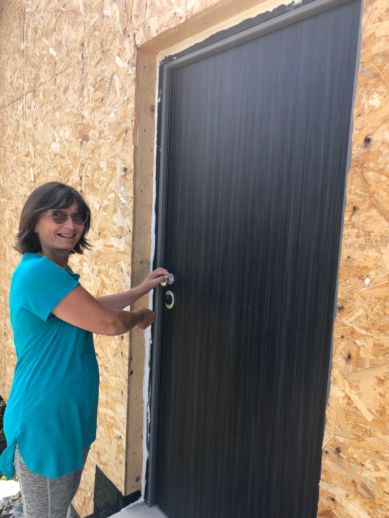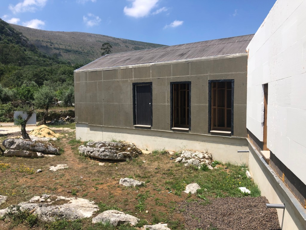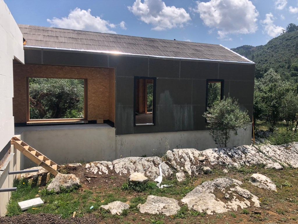 We arrived back at the build site to find some more progress being done on the house, but the windows had still not been delivered. Our architect is now getting as frustrated as we are, it has been months of waiting now. And just to rub salt into the wound, the algorithm imbedded into Facebook seems to hear our conversations and keeps popping advertisements from local window installers that say delivery times are less than a month! (It is scary the things our phones can do!). But progress is still progress. At least the doors are now fitted! They are also now preparing the exterior surfaces ready for the cork cladding which is ongoing.