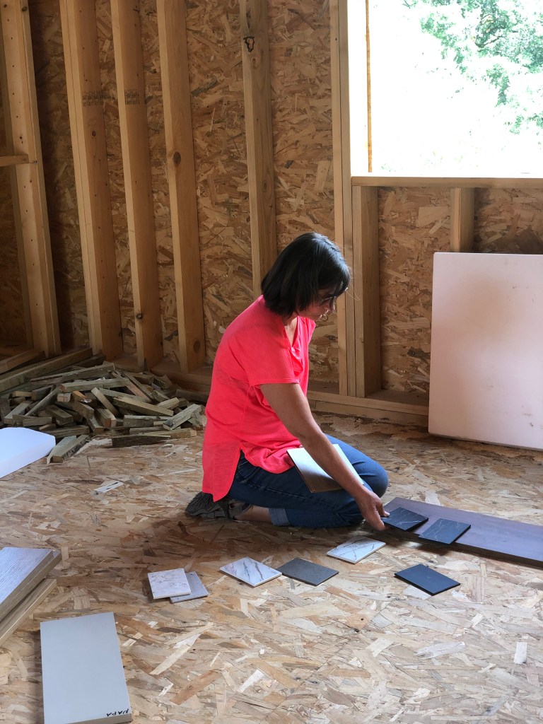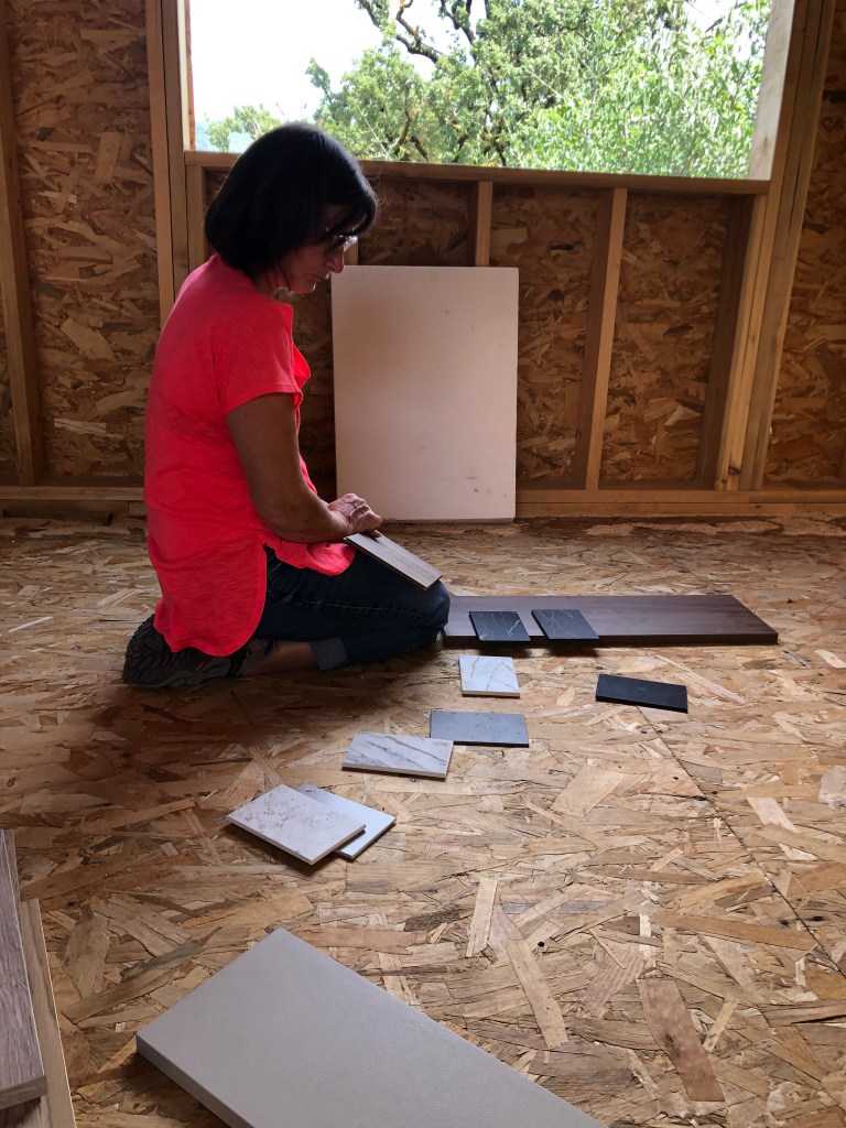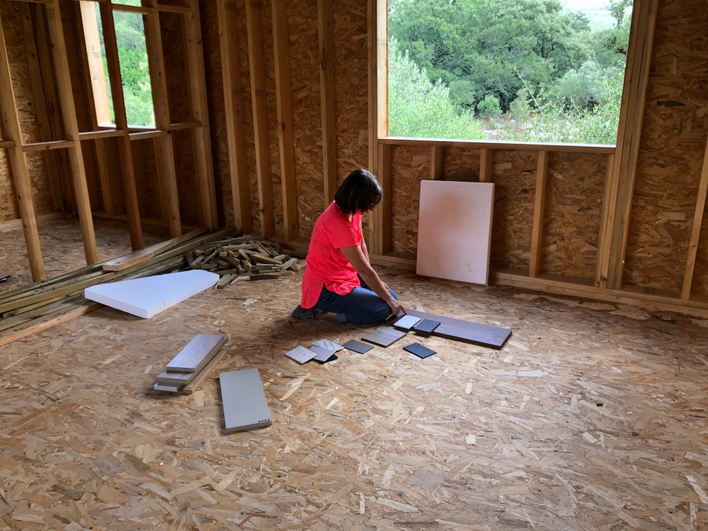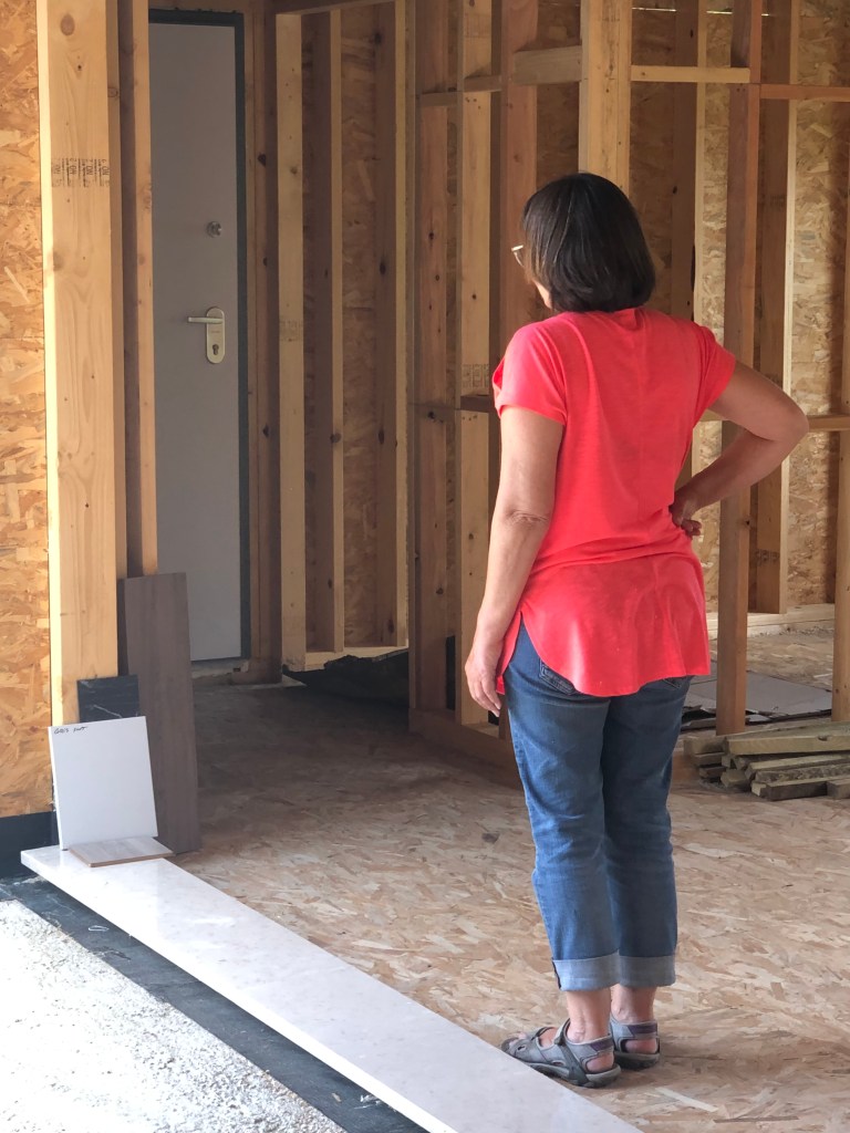 So after the weekend, we went over to pay for the BBQ materials and popped into see our architects who had samples for the kitchen cabinets and worktops. We took a few of these over to the house to see how they played with the natural lighting. This is where Annette thrives, she is very good at visualizing things. Even with no drywall or painted surfaces, she can see in her mind what it will look like finished. She spent a good amount of time just comparing the materials and visualizing.