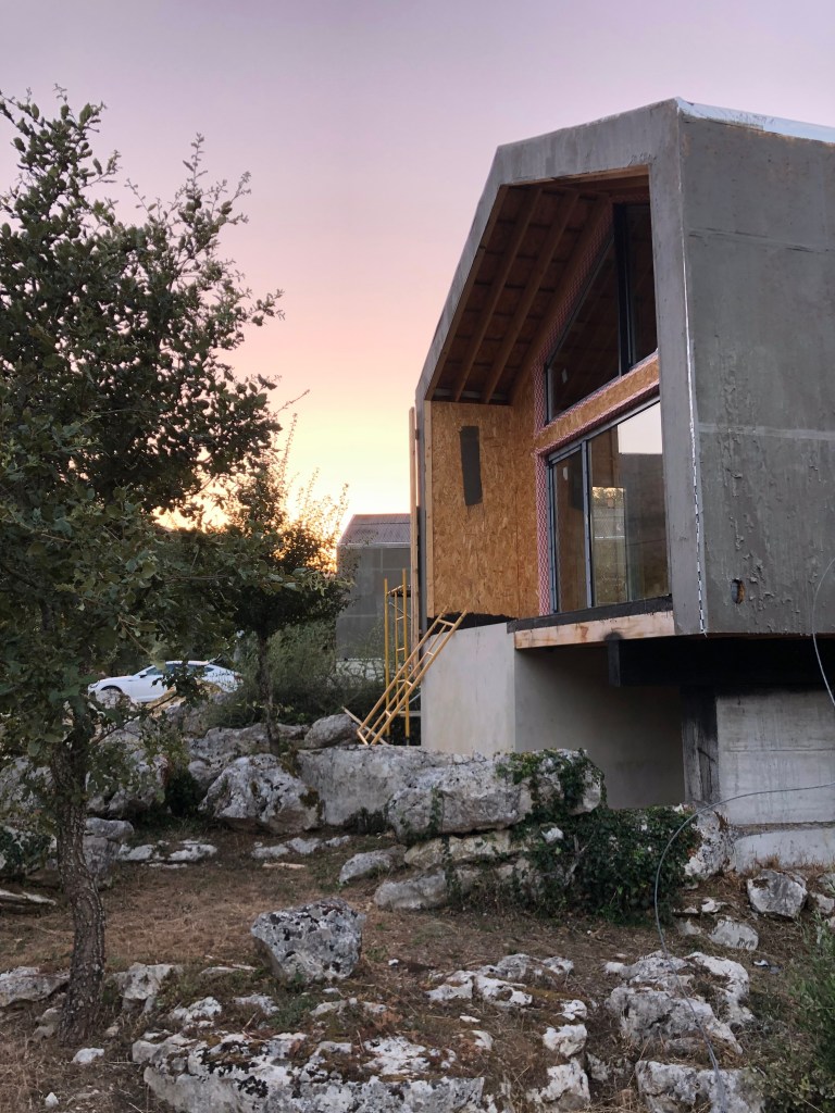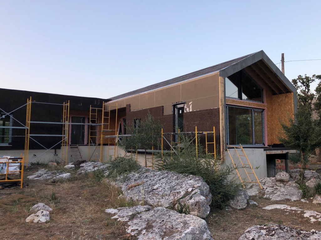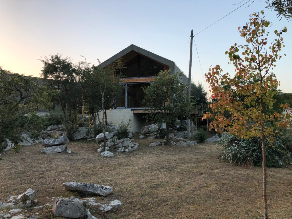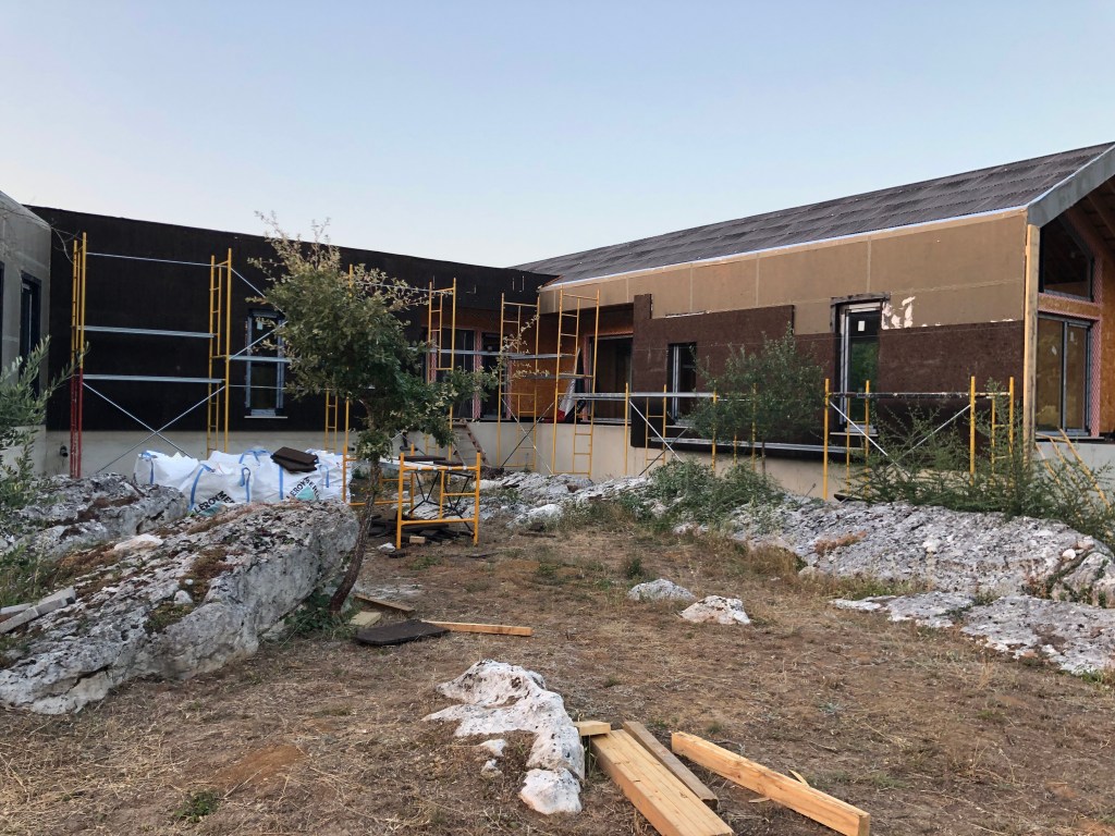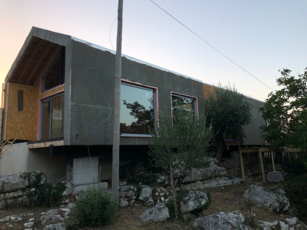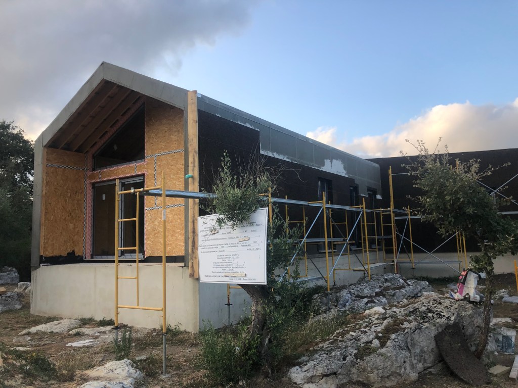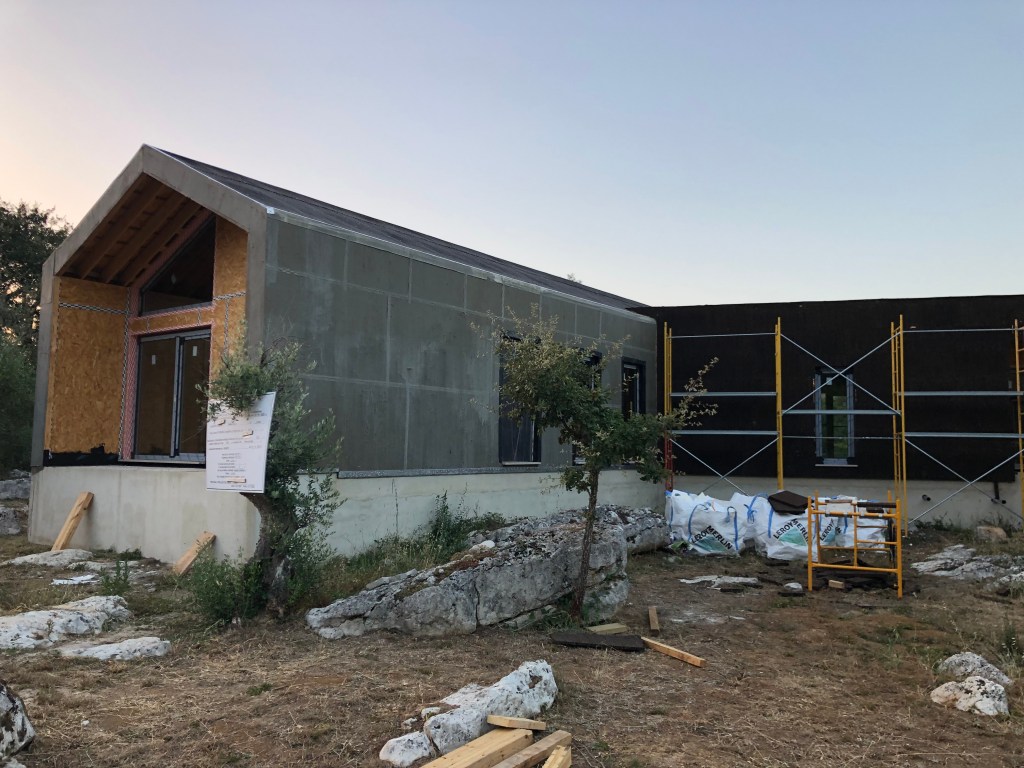 If you are interested in the house progress, the latest news is that they are continuing with the cladding on the exterior. The cork is being applied now. They have had to build a work platform at the living-room side where the building is cantilevered over the rock face, so not that easy to access. After the workmen had left, we actually climbed up onto it to help clear all the vegetation that was starting to encroach. We actually did this all the way around the property too, giving the workmen clear access without having to worry about clearing branched and bushes etc. It was nice to work in the cool evening, we can’t imagine how they work through the heat of the day. It did make us think about what we need to do about the vegetation taming on an ongoing basis though. We might need some sturdy ladders eventually. We also need to start processing all these cuttings for either BBQ wood or mulch too.