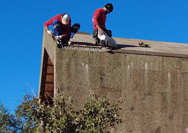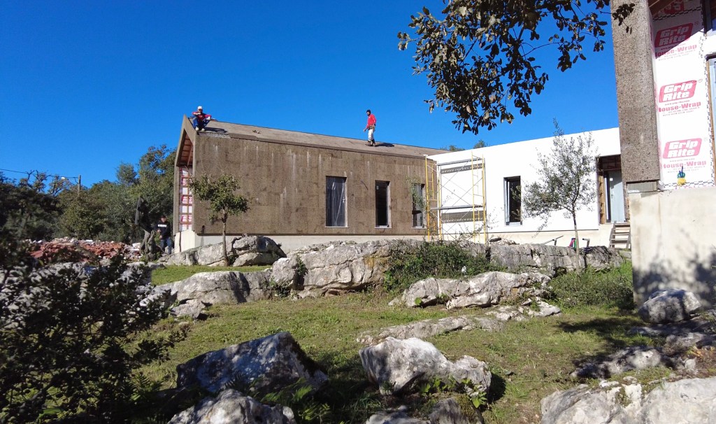 The weather was lovely during the week which allowed the builders to actually continue some work on the roof. The roof is getting a cork finish similar to the cladding on the exterior walls. It was started weeks ago, but as yet is still not finished. we think it is because of the supply of cork has been slow, but we hope to see it finished soon. The apex is still not covered as well as the edges where the hidden guttering goes. This has allowed rain water to get behind the cork causing streaks where it comes out, but we have been told that these will stop when the edging and roof is completed. It was great to see the builders working and ´singingˋ while working up on the roof!