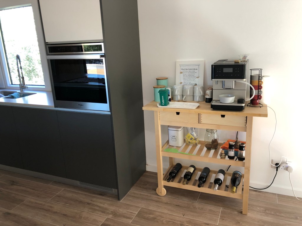 As well as our new friends at Siopa e Baptista, our love affair with the Scandinavian furniture continues. We ordered our wardrobes. They were delivered thanks to the very helpful guys at the IKEA design store in Leiria Shopping Centre. At least the guest bedroom closet now has somewhere to put clothes! We can’t yet fit our main closet wardrobes. The door from the bedroom still needs to be finished by the builders. In the living-room we softened the appearance a little by adding a rug which also added a little color too. We also built some more storage for towels etc for the shower rooms. Additionally, we built some bedside tables for both bedrooms. In the kitchen we added a coffee station with some extra storage. That allows it to free up a bit more worktop space. These small touches have started to make it really feel like a home now. We have only unpacked a few things so far.