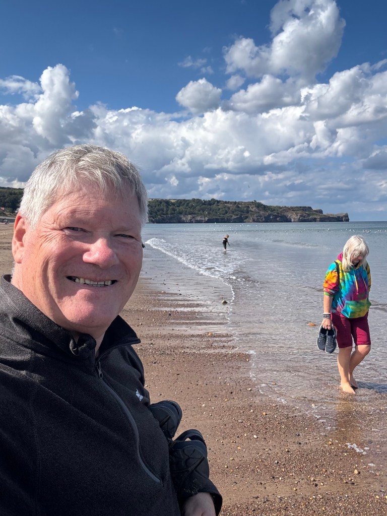 That was our furthest northern point for this visit. From there, we headed south to Yorkshire. We went to visit Wayne’s sister, niece, and grand nephew. Wayne’s niece and her husband have recently renovated a flat in Filey as a rental. It was unoccupied for a weekend, so they offered us to use it during our stay. We gratefully accepted and had a fabulous time in Filey. Wayne spent some time there when he was younger. It hasn’t changed much over the years. We enjoyed dipping our toes in the chilly North Sea once again.